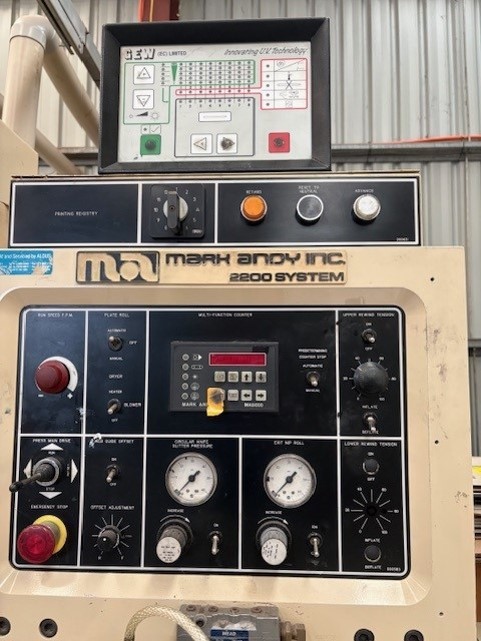 width of material min. 200 mm to max. 450 mmWEB WIDTH, FULL UV 9 COLOUR,has hot air units on 2 print stations,(as well as UV)turn bar x 1 can be moved to any unit as required,unit 9 used for varnish,Auto Register,4 x rotary die stations,has total job count (however no total counter),has inspection camera,waste rewind.NO DELAM/RELAM,CORONA TREATER,SHEETING STATION.No chiller unit but the piping is all there.Used to run cold water through the piping but had no chiller with the machine.